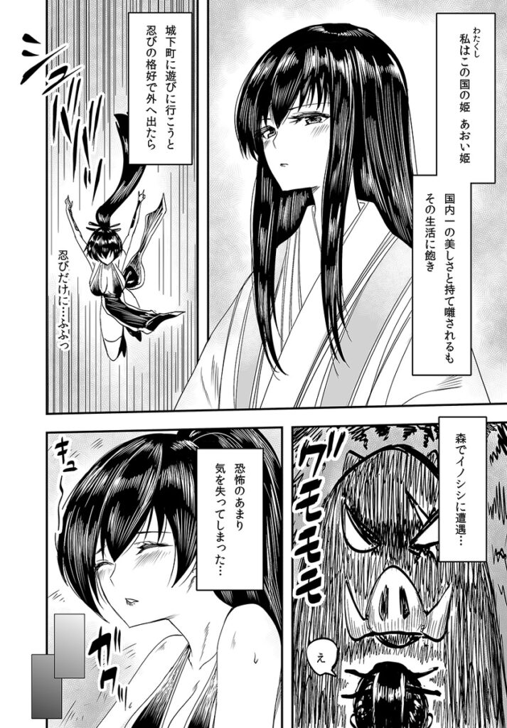 【エロ漫画】の作品内容:森で巨大イノシシに遭遇して気絶した姫様がくのいちだと勘違いした山男に拉致されてしまった!カラダを拘束されておっぱい揉まれたり手マンされて中出しレ●プされちゃう・・・