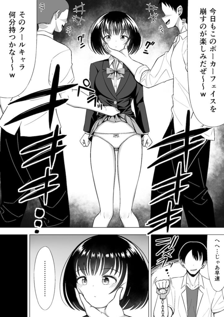 【エロ漫画】の作品内容:無口でクールな巨乳JKが不良達から性的イジメをされちゃう!おっぱい揉まれたり手マンされたり電マ責めされて中出しレ○プされちゃう!